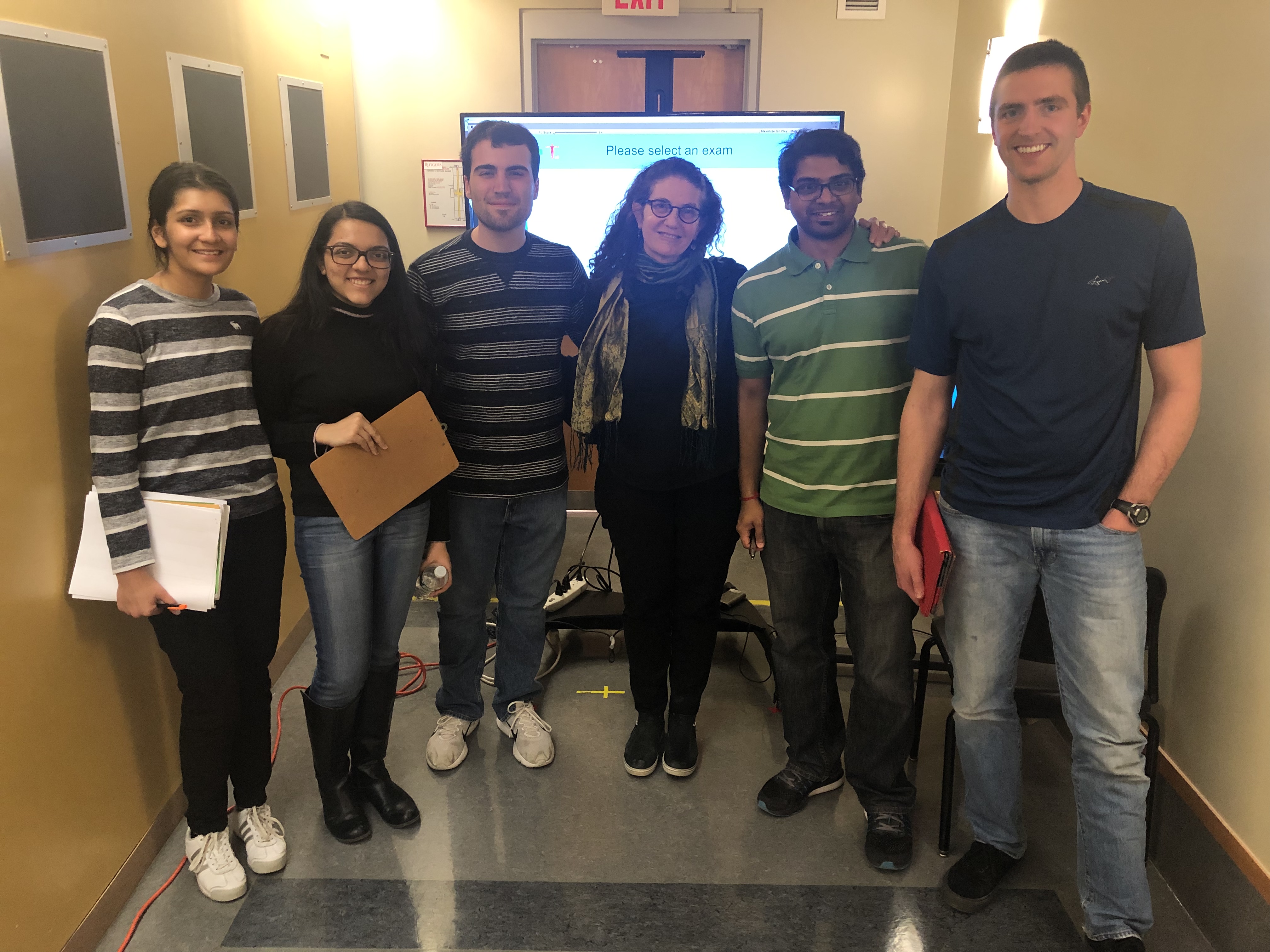 Risha and Aashka (far left) are running usability studies with a new examination suite for physical therapists. This is part of a NJIT-Rutgers collaboration that involves using sensors and kinematic data for a stroke rehabilitation system, led by Dr. Judith Deutsch (middle).